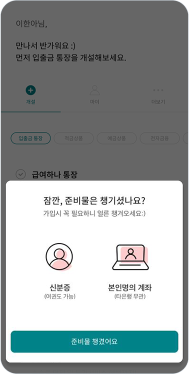 OVERVIEW 하나원큐 App 비대면 계좌 개설 서비스 비대면 계좌개설 서비스는, 은행 지점 방문 없이 하나원큐 앱을 통해 비대면 상에서 계좌를 즉시 개설할 수 있는 서비스입니다. 고객이 쉽게 이해하고 이탈과 스트레스 없이 자연스럽게 서비스를 이용할 수 있도록 친근한 톤앤매너와 UX라이팅을 적용하여 설계하였습니다.
