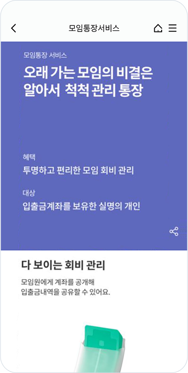 OVERVIEW. 하나원큐 모임통장 서비스 하나원큐 앱 전용 ‘모임통장 서비스’는 모임원 모두가 회비를 직접 보내고 관리할 수 있는 서비스입니다. Full 3D로 제작한 비주얼을 적극 활용하여 시각적인 주목도를 높였으며, 모임 생성, 회비 납부, 회비 내역을 편리하게 이용할 수 있는 최적의 디자인과 UX를 구현하였습니다.